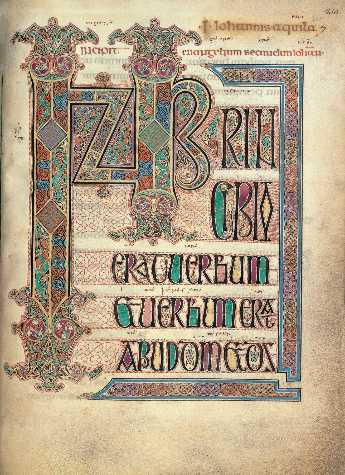 An intricately decorated incipit page, showing the first words of the Gospel of St John, from the Lindisfarne Gospels. The Lindisfarne Gospels, c. 700, parchment, 36.5 x 27.5 cm (The British Library)