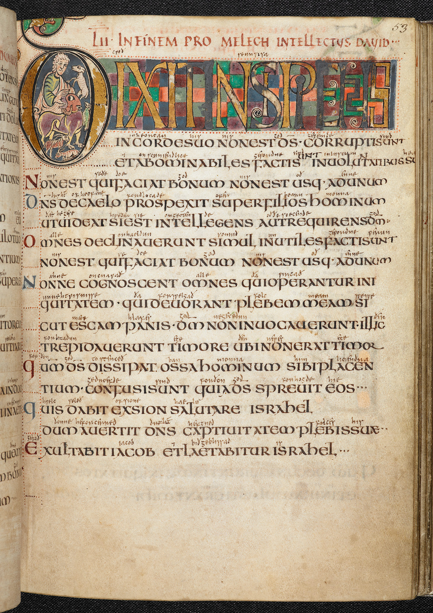 A historiated initial D representing David as a shepherd, rescuing a lamb from a lion at the beginning of Psalm 38, from the Vespasian Psalter. Psalter (‘The Vespasian Psalter’), 2nd quarter of the 8th century–mid-9th century (The British Library)